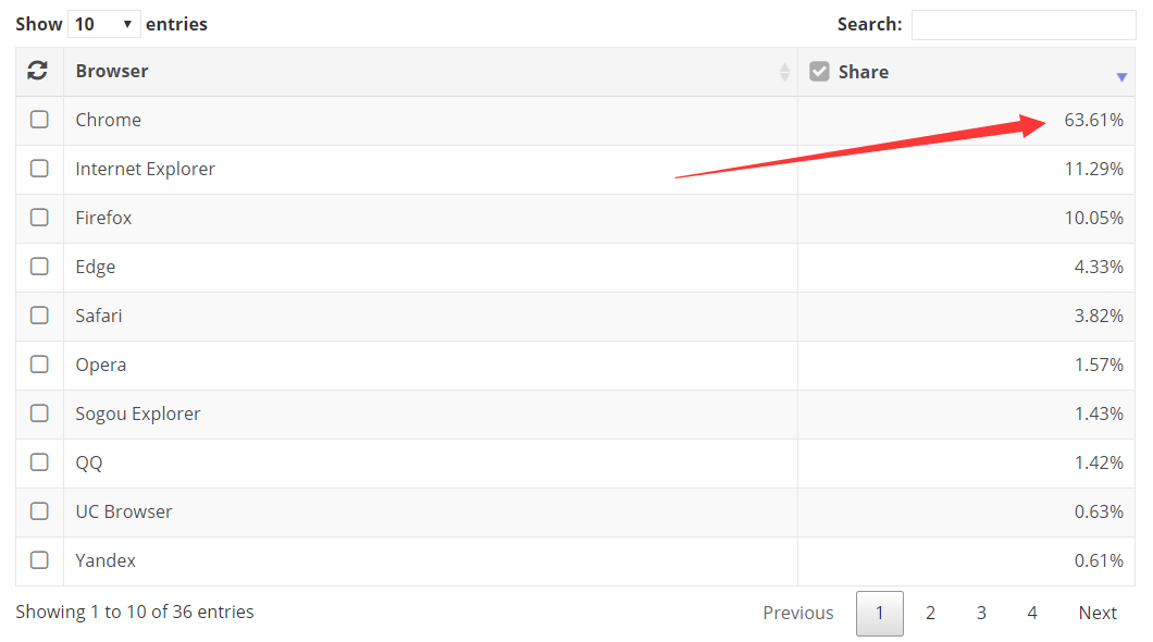 以2018年1月至10月的全球浏览器市场份额为例,Chrome独拔头筹,全球占比63.61%,反倒是以前的老对手全被碾压到了后面。